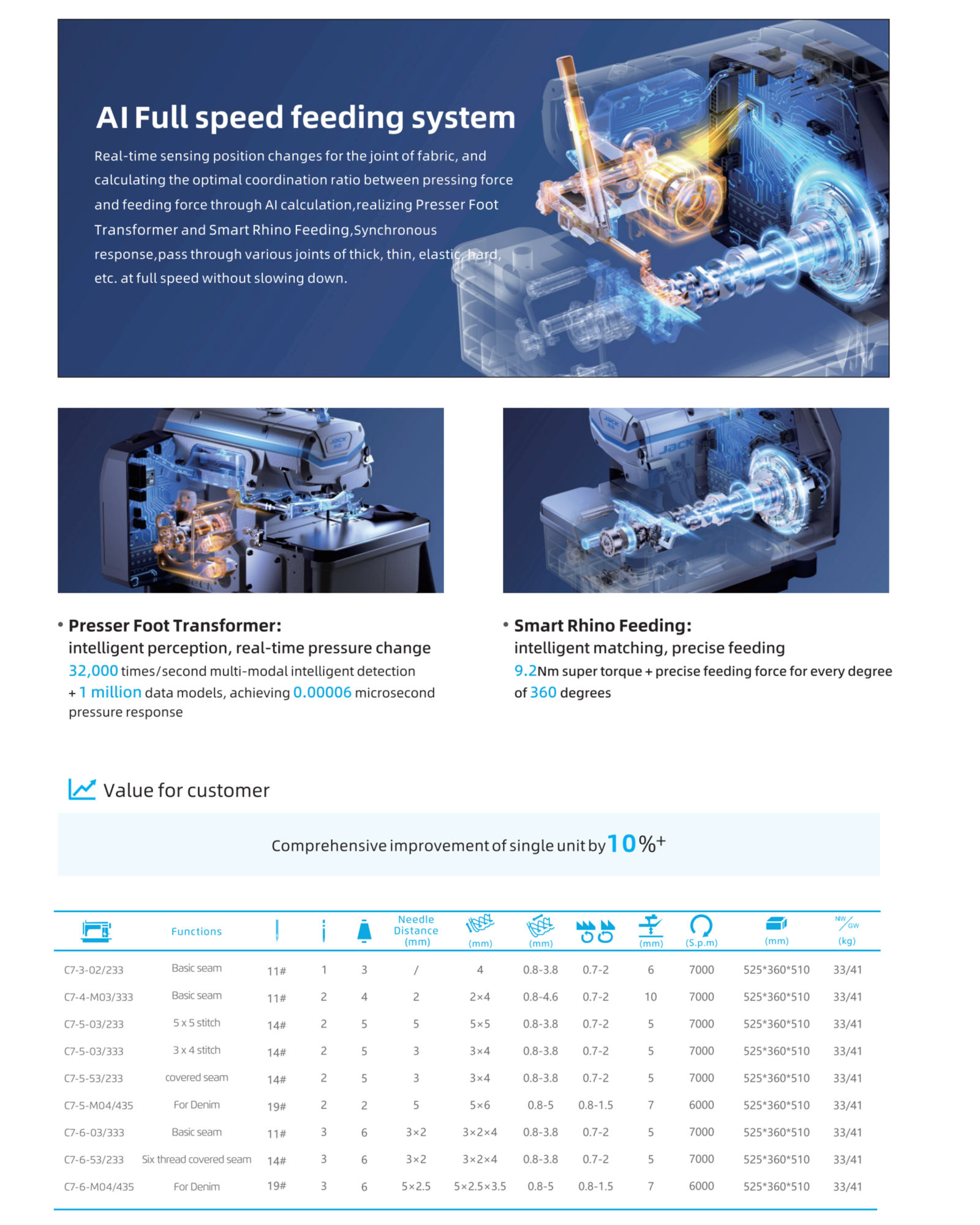The AI Full-Speed Feeding System is a next-generation intelligent feeding solution designed to deliver stable, high-quality stitching at full sewing speed under constantly changing material conditions. Powered by advanced AI algorithms, the system continuously monitors fabric thickness variations in real time and precisely calculates the optimal pressing force and feed force required for consistent fabric control.