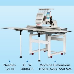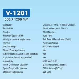 The Vidya V-1201 is a high-performance computerized embroidery machine designed for large-format and commercial embroidery production. With a wide 500 × 1200 mm embroidery area, it allows full front and back embroidery in a single frame, making it ideal for kurtis, gowns, uniforms, and fashion garments.