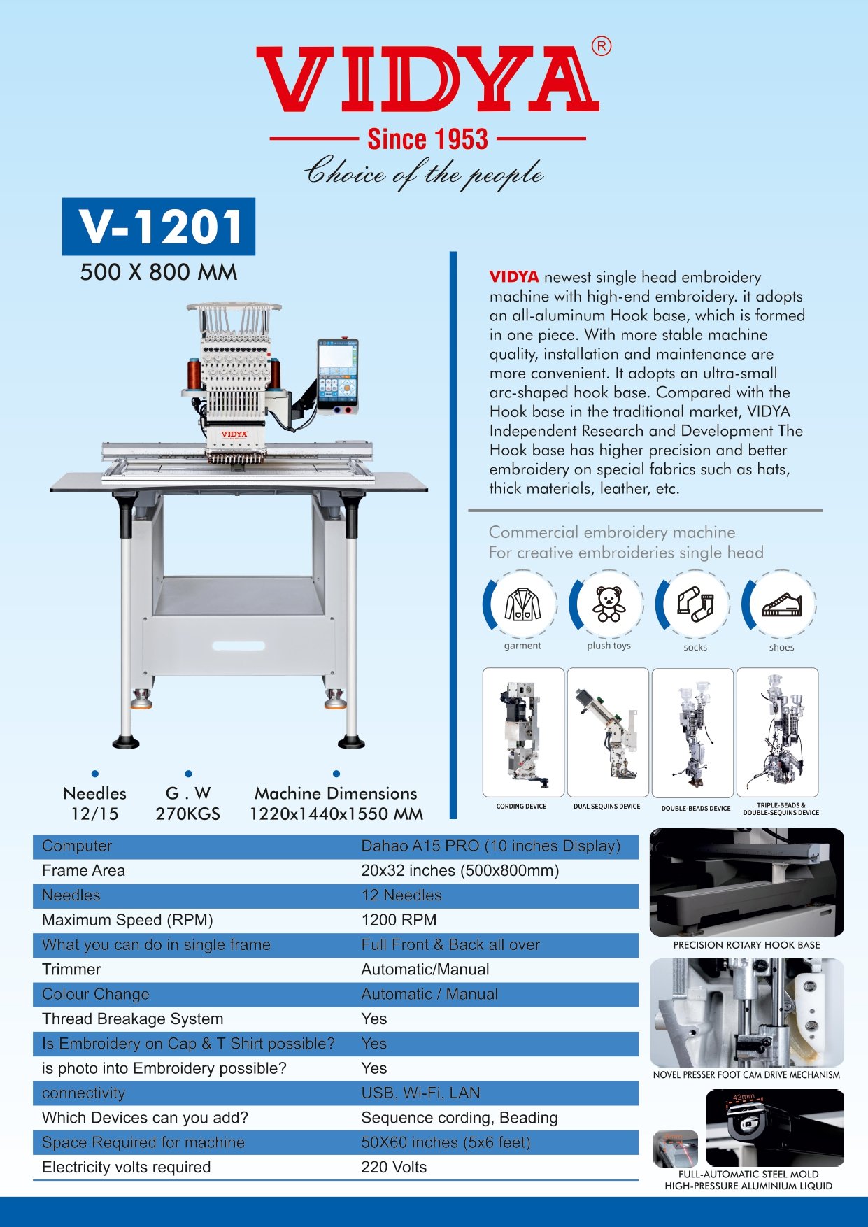 VIDYA newest single head embroidery machine with high-end embroidery. it adopts an all-aluminum Hook base, which is formed in one piece. With more stable machine quality, installation and maintenance are more convenient. It adopts an ultra-small arc-shaped hook base. Compared with the Hook base in the traditional market, VIDYA Independent Research and Development The Hook base has higher precision and better embroidery on special fabrics such as hats, thick materials, leather, etc.